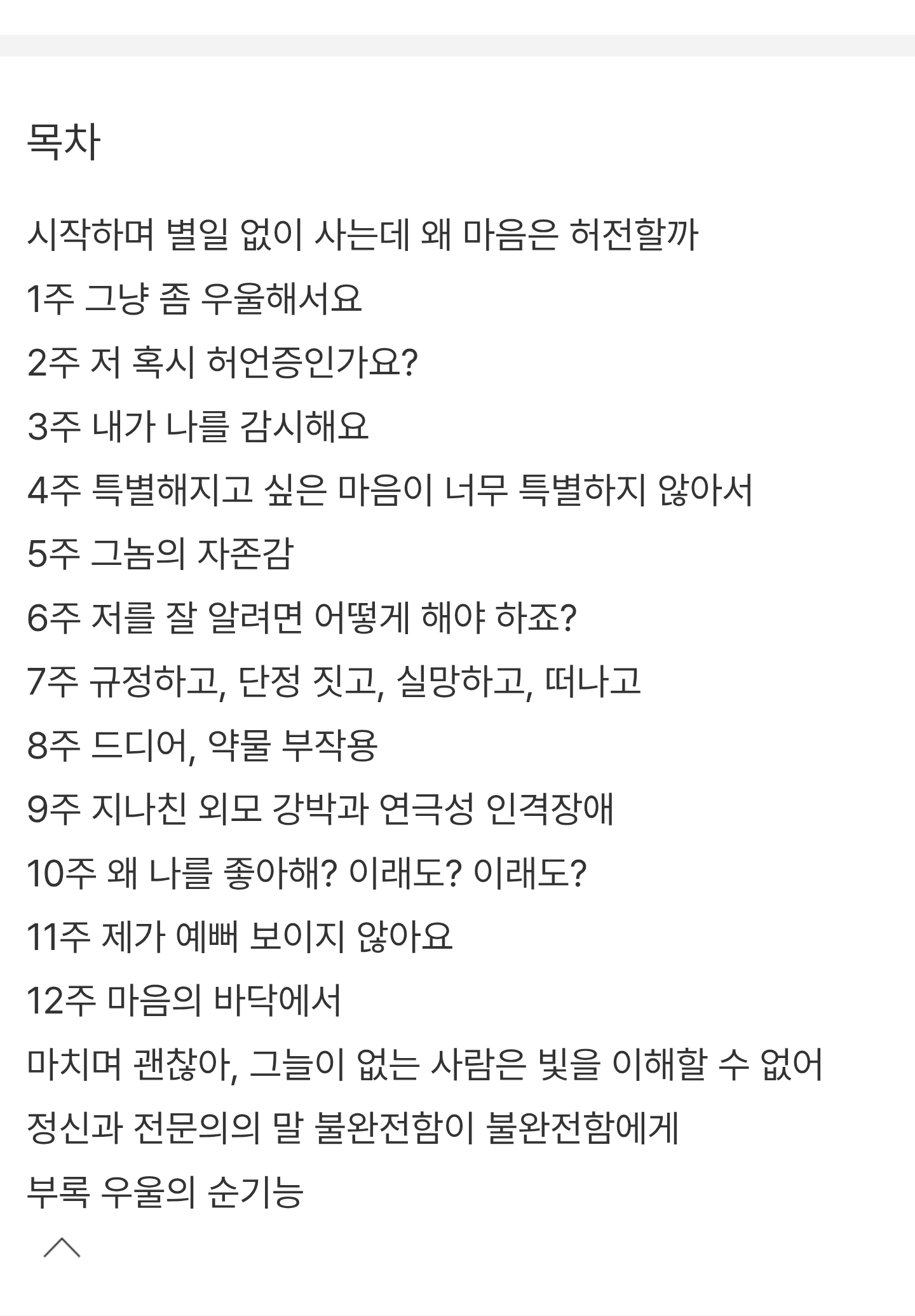 책 속에서는 백세희 작가의 어린 시절의 트라우마에서부터 미묘하고 복잡한 가족관계에서 오는 갈등들과 사람들과의 관계에서 겪고 있는 혼란스러움과 본인의 취약점들을 의사에게 솔직하게 털어놓는 방식으로 채워져있었다.