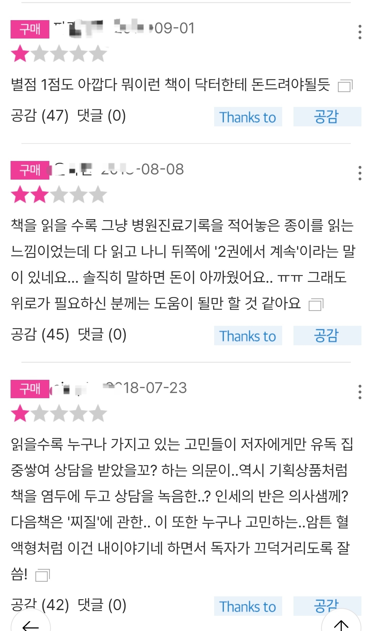 타인에게 가혹한 잣대를 들이대며, 키보드를 감정적으로 두드리면서 본인의 기대감을 충족시켜주지 못한 책에 대해서 배설물처럼 댓글을 남기는 현상을 더이상 방치하지 않았으면 좋겠다.