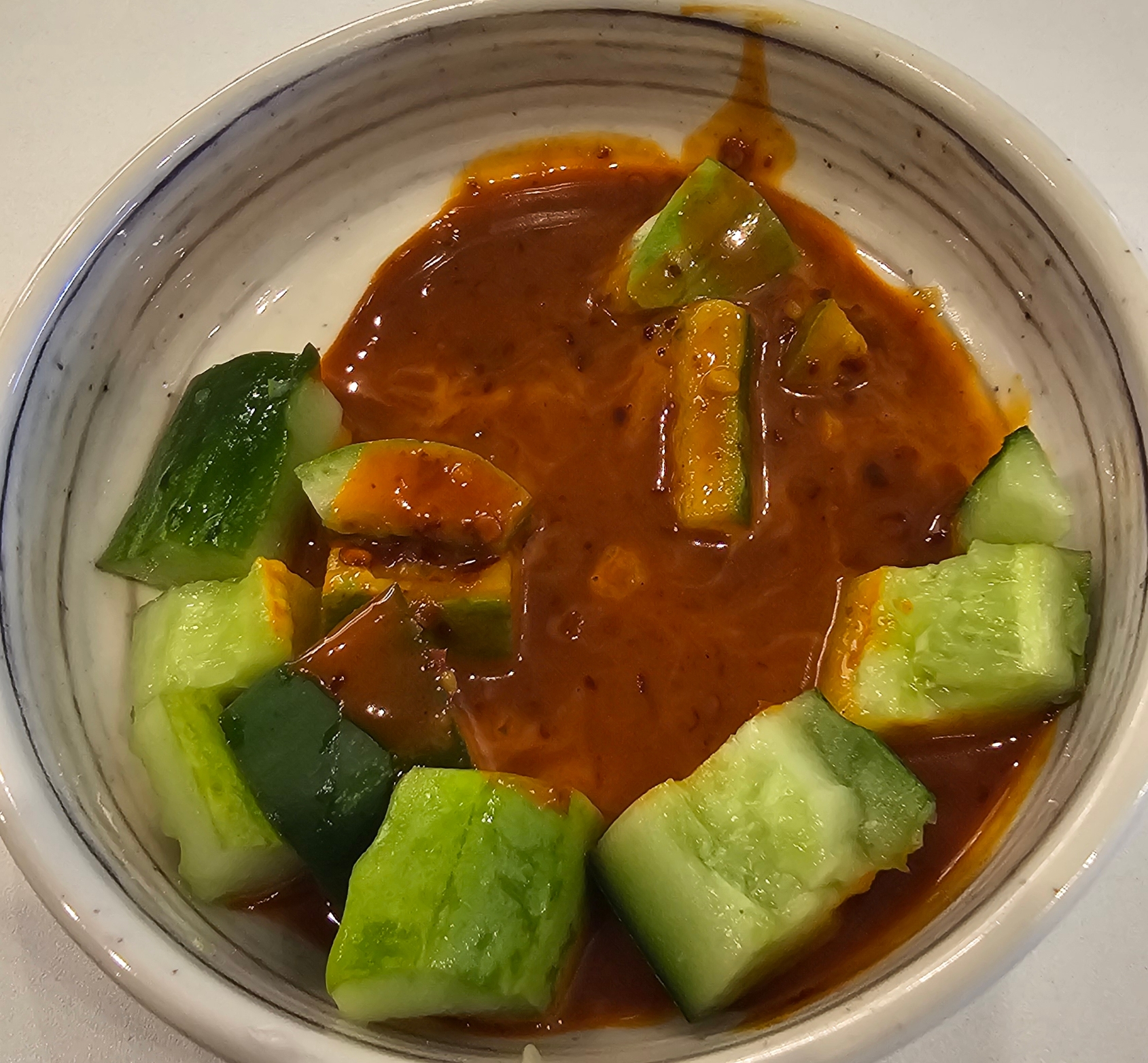 맥주를 시키자, 오이에 양념장이 뿌려진 반찬을 내어주시는데 양념장의 맛이 매우 고소하니 맥주안주로 딱이었다.