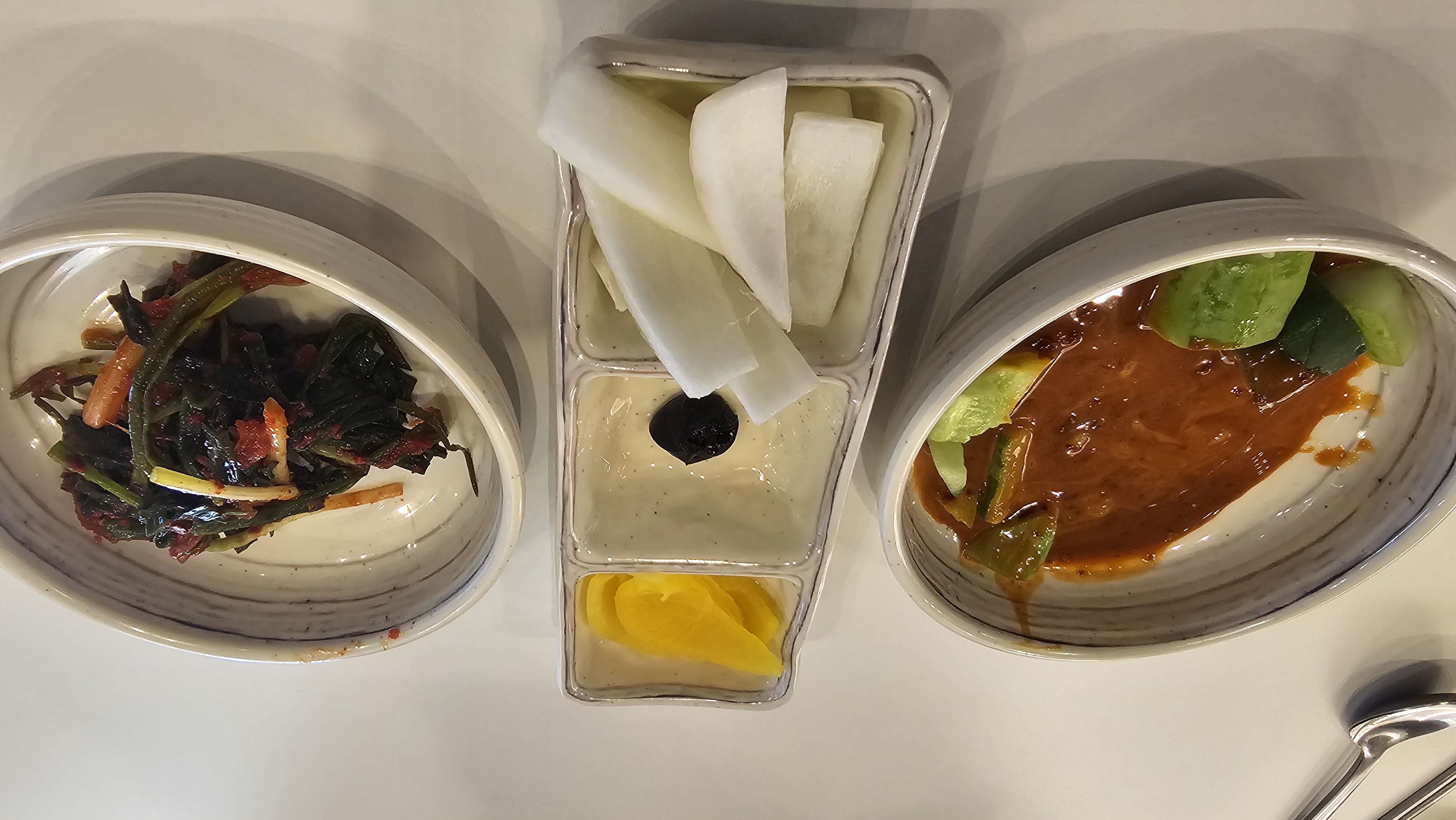 주문을 하면 양파와 단무지가 써빙되고, 추가 반찬은 셀프바를 이용하면 되는데 파김치가 있어서 한접시를 퍼왔다.