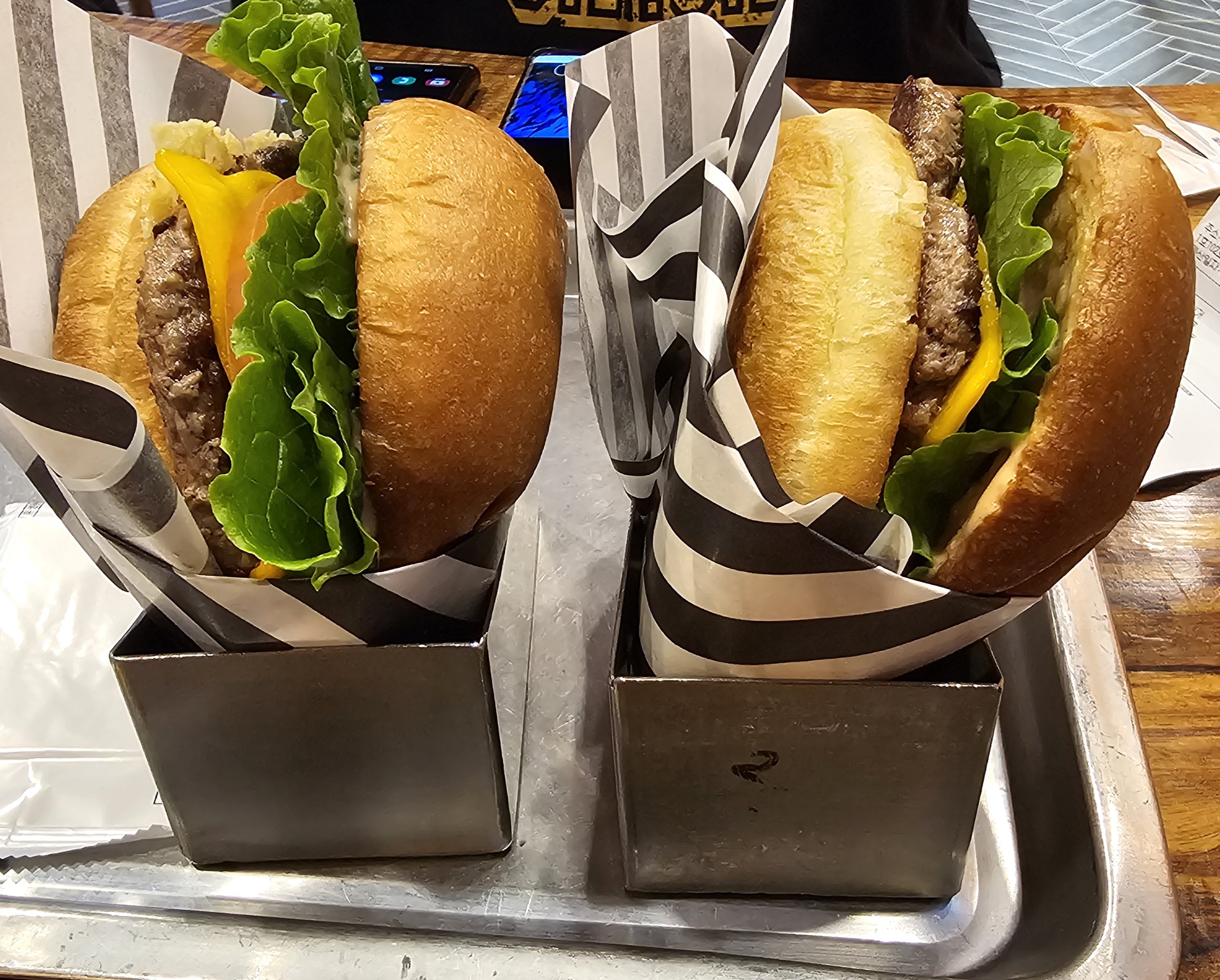 잠시후 주문한 2개의 버거가 서브되었는데, 어떤 것이 치즈버거이고 어떤 것이 루이스 버거인지 전혀 표시가 되어 있지 않았다. 일단 나는 친구보다 비싼 루이스 버거를 주문했기때문에 당연히 내용물이 더 많이 들어가보이는 두툼한 햄버거를 집어들었다.