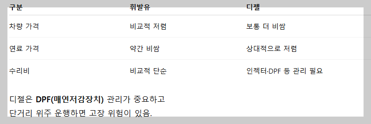 디젤차의 경우, 소음·진동이 상대적으로 큼 (요즘은 많이 개선됨)