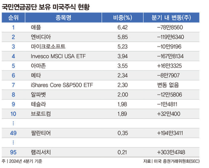 대표적으로 엔비디나, 팔란티어, 램리서치등 빅테크 기업 위주로 보유하고 있다. 국민연금은 오는 2028년까지 미국주식의 보유비중을 약 60%이상으로 확대할 예정이라고 한다.