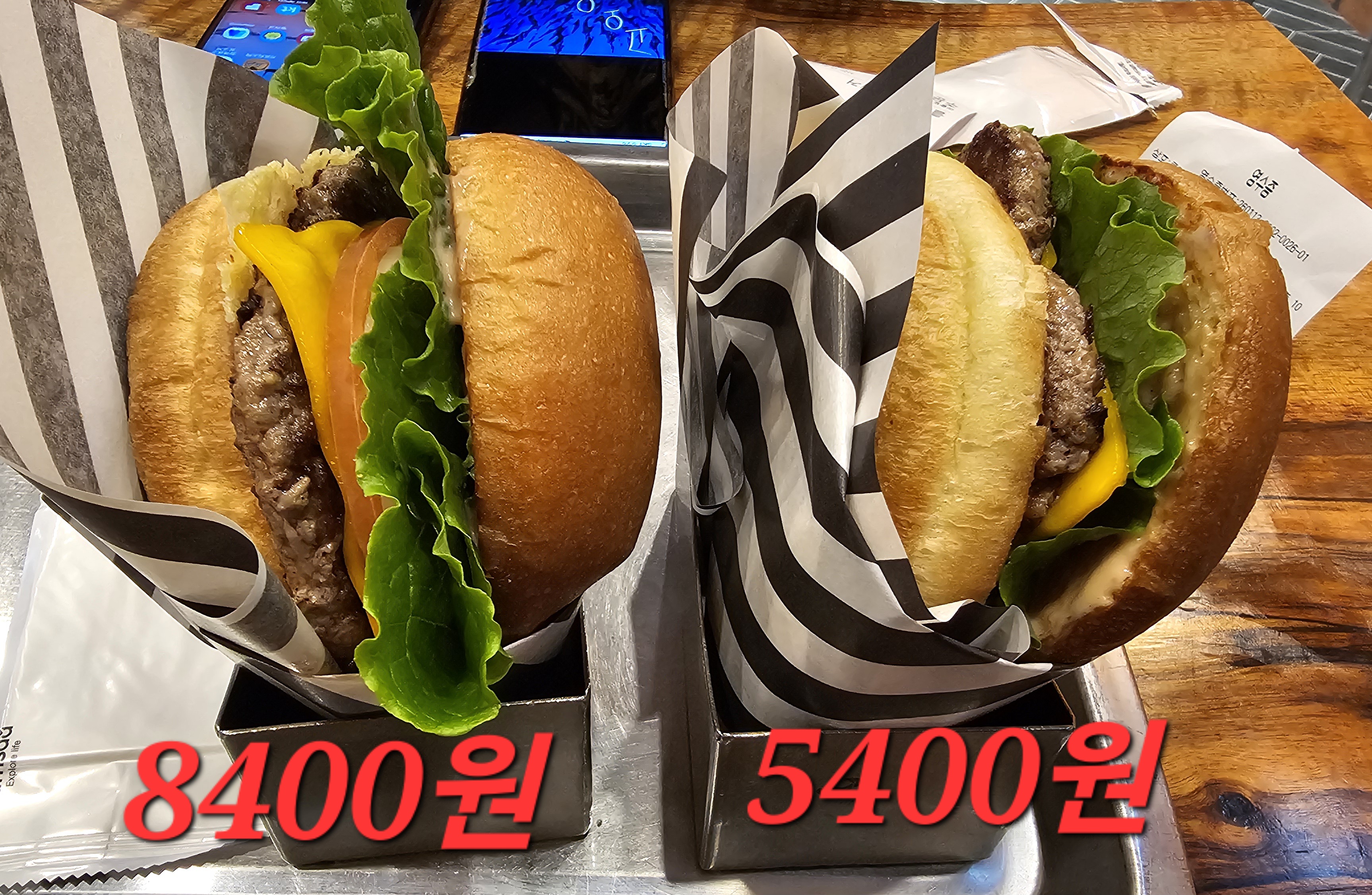 잠시후 주문한 2개의 버거가 서브되었는데, 어떤 것이 치즈버거이고 어떤 것이 루이스 버거인지 전혀 표시가 되어 있지 않았다. 일단 나는 친구보다 비싼 루이스 버거를 주문했기때문에 당연히 내용물이 더 많이 들어가보이는 두툼한 햄버거를 집어들었다.